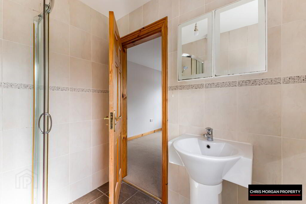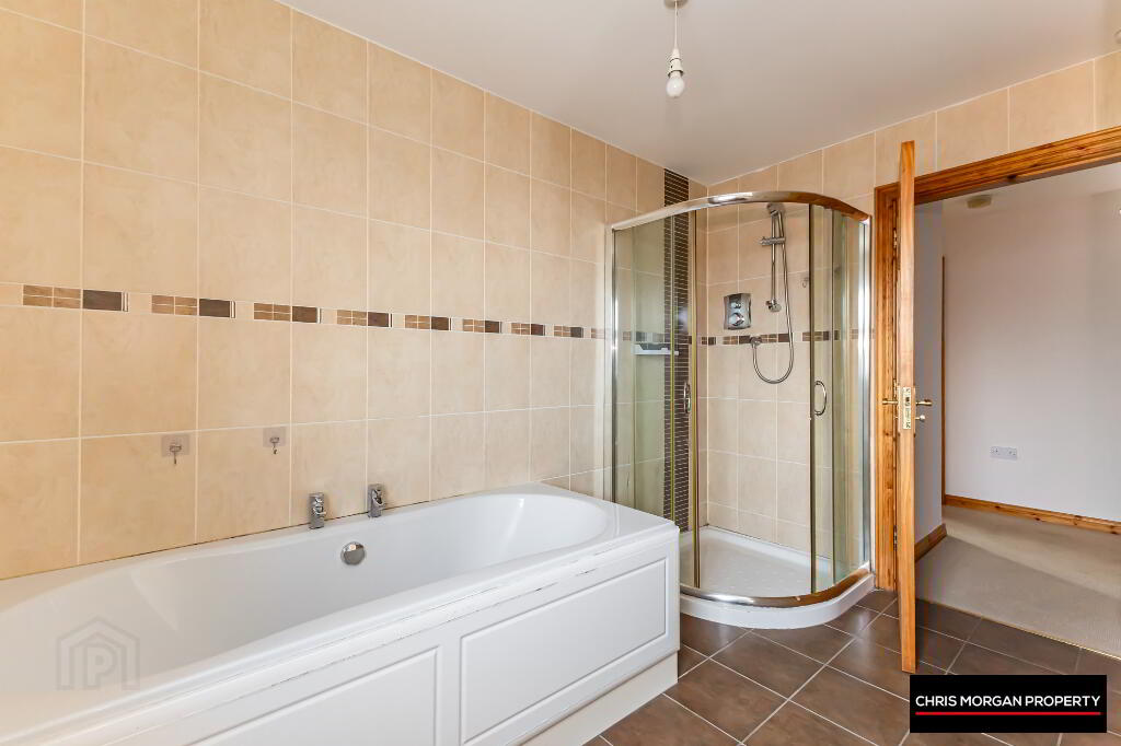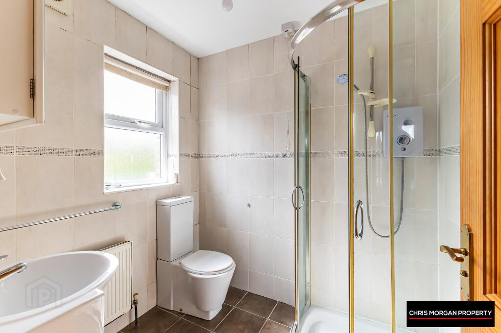 TILED FLOOR AND WALLS, WC, WHB, SHOWER, SINGLE RADIATOR, EXTRA FAN