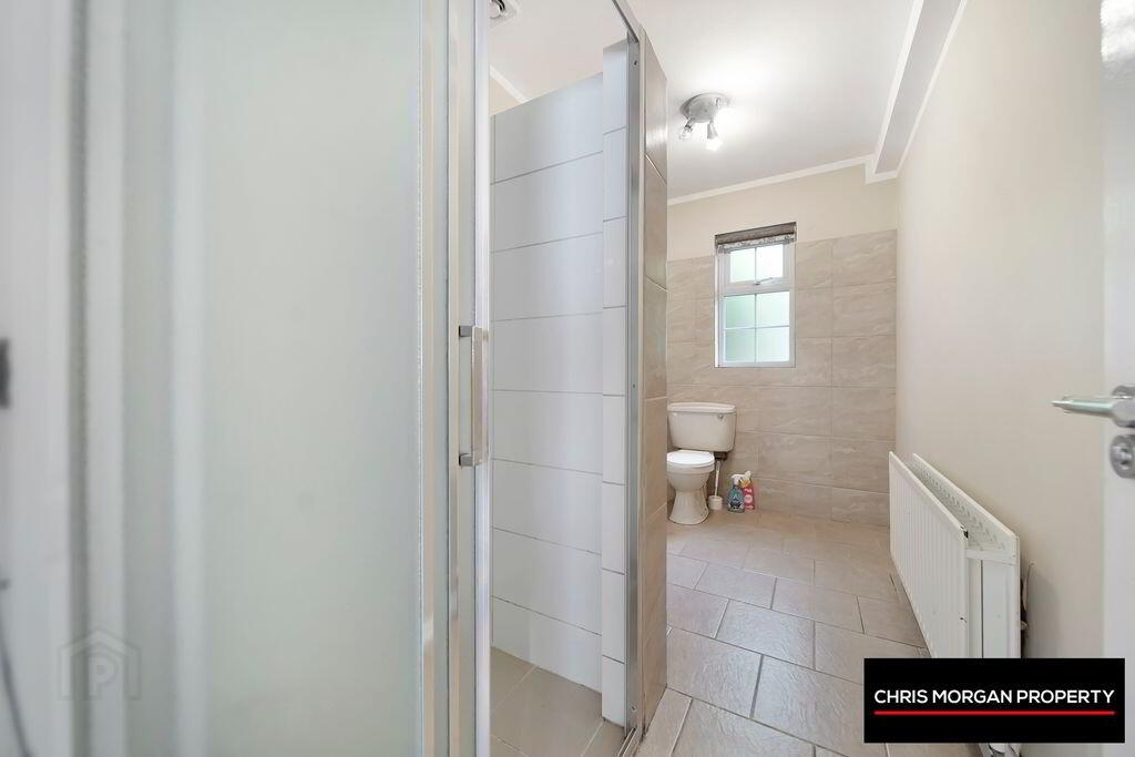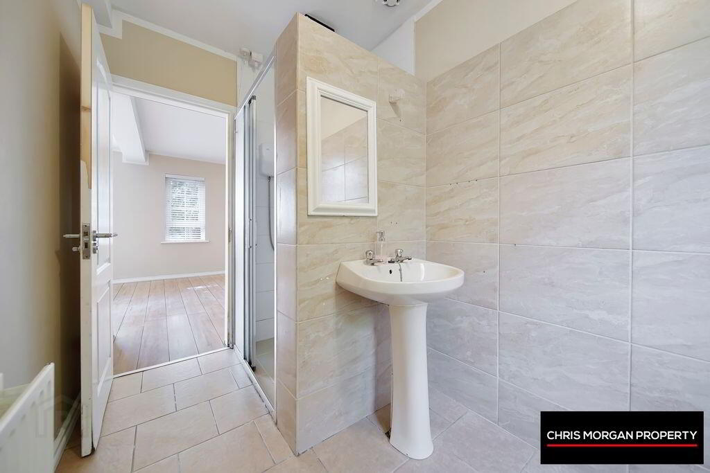 TILED FLOOR AND WALLS, WC, WHB, SHOWER, DOUBLE RADIATOR, EXTRA FAN