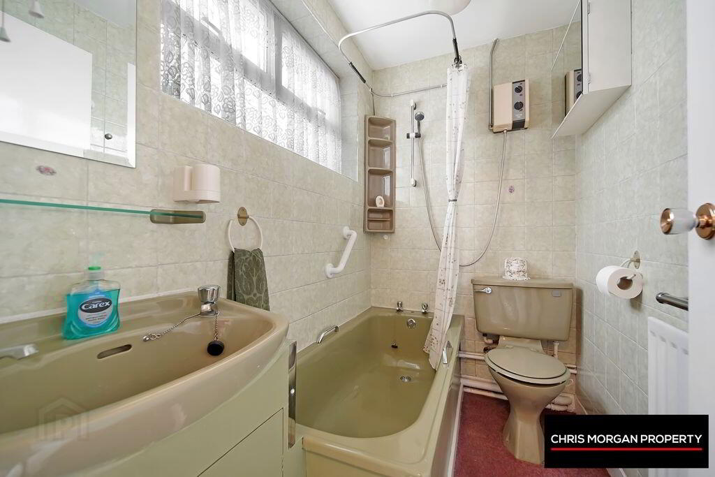 CARPET FLOOR, TILED WALLS, WC, WHB, BATH WITH SHOWER HEAD, SINGLE RADIATOR