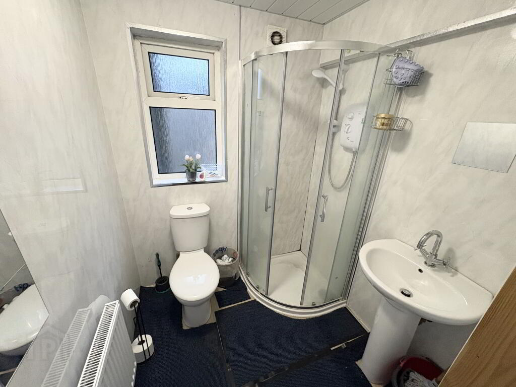 LAMINATE FLOOR COVERING, PVC CLADDED WALLS AND CEILING, WC, WHB, SHOWER, SINGLE RADIATOR, EXTRA FAN