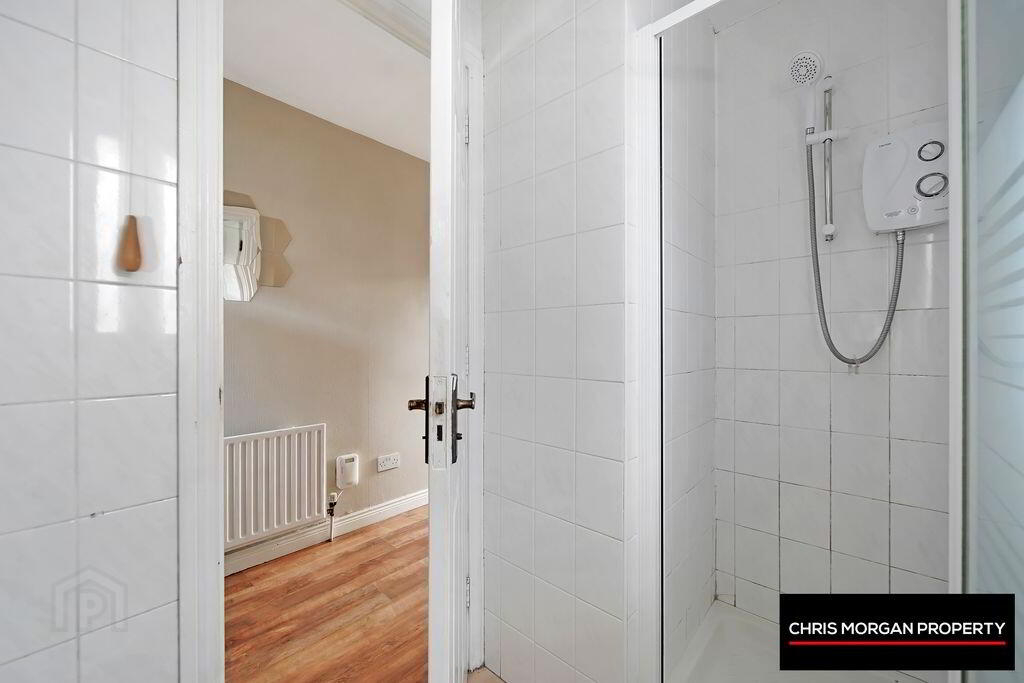 TILED FLORO AND WALLS, WC, WHB, SHOWER, SINGLE RADIATOR, EXTRA FAN