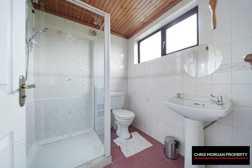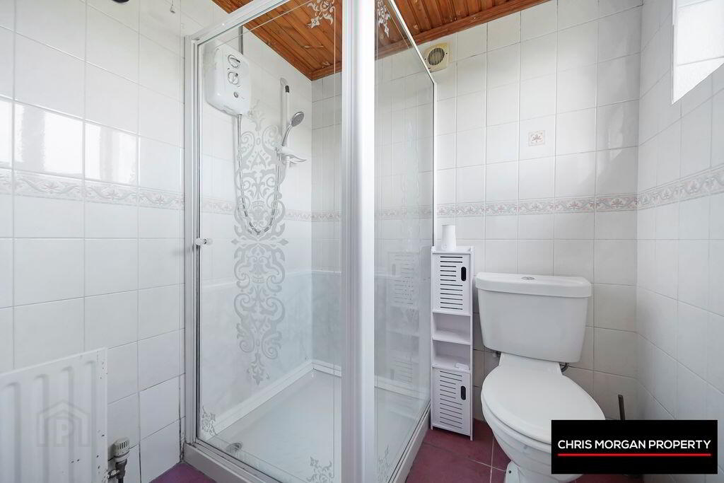 TILED FLOOR AND WALLS, WC, WHB, SHOWER, SINGLE RADIATOR, EXTRA FAN