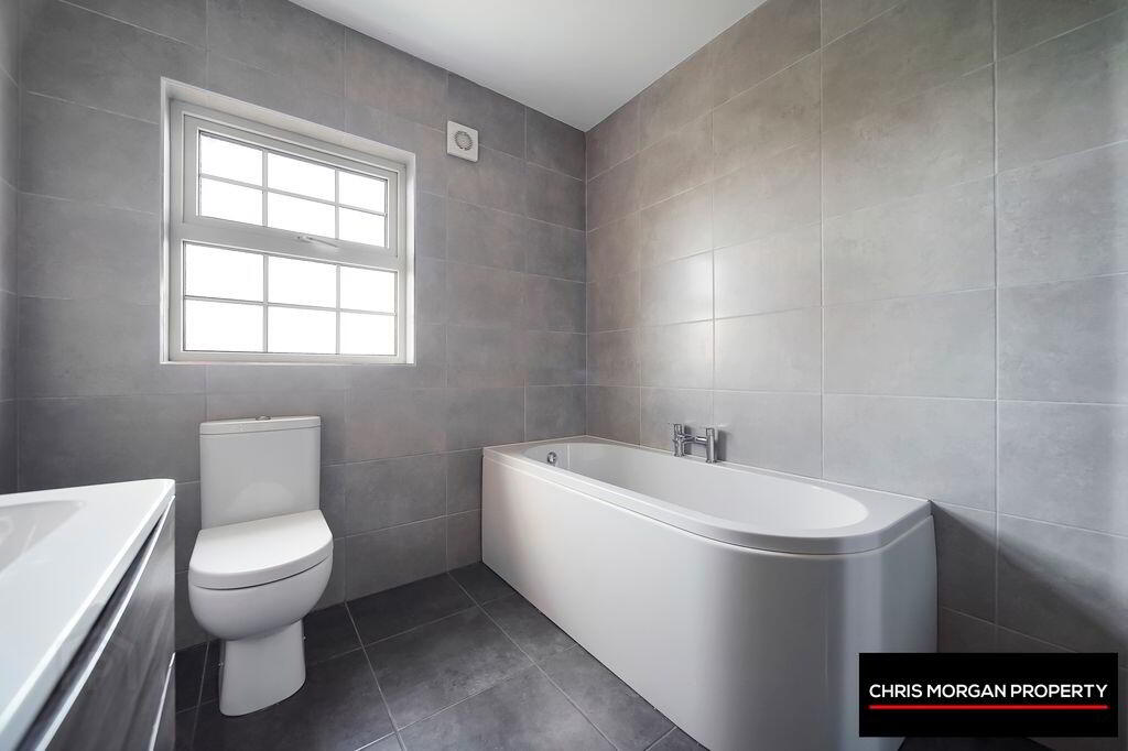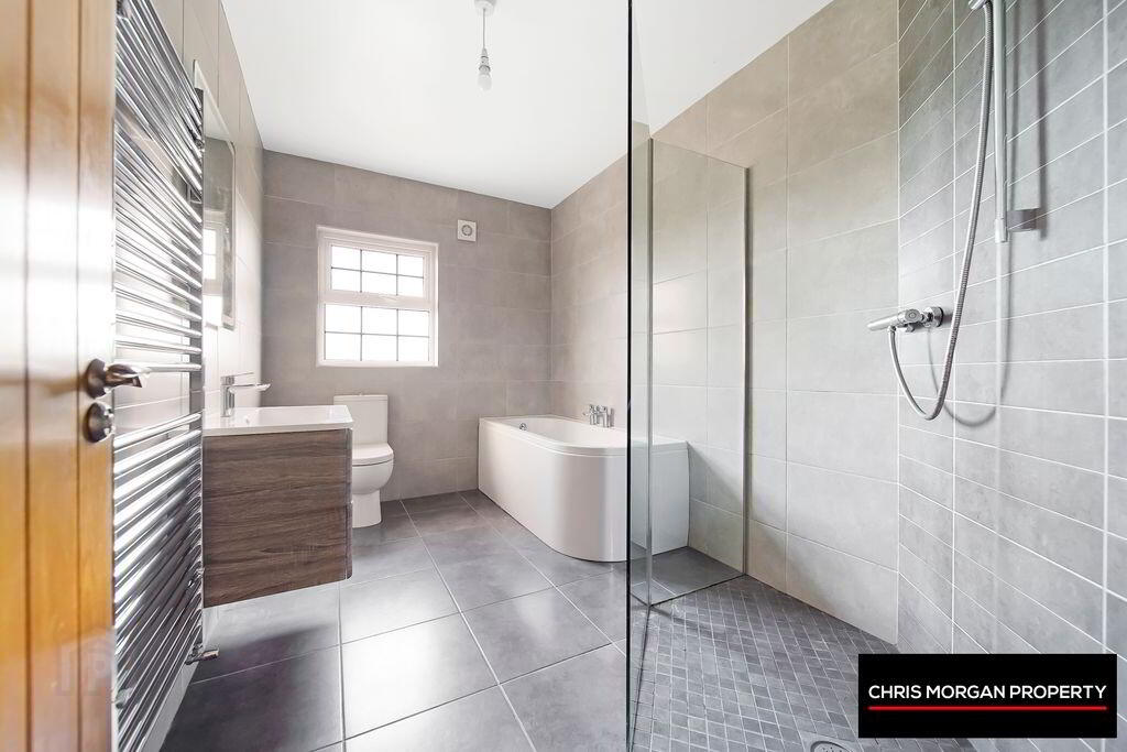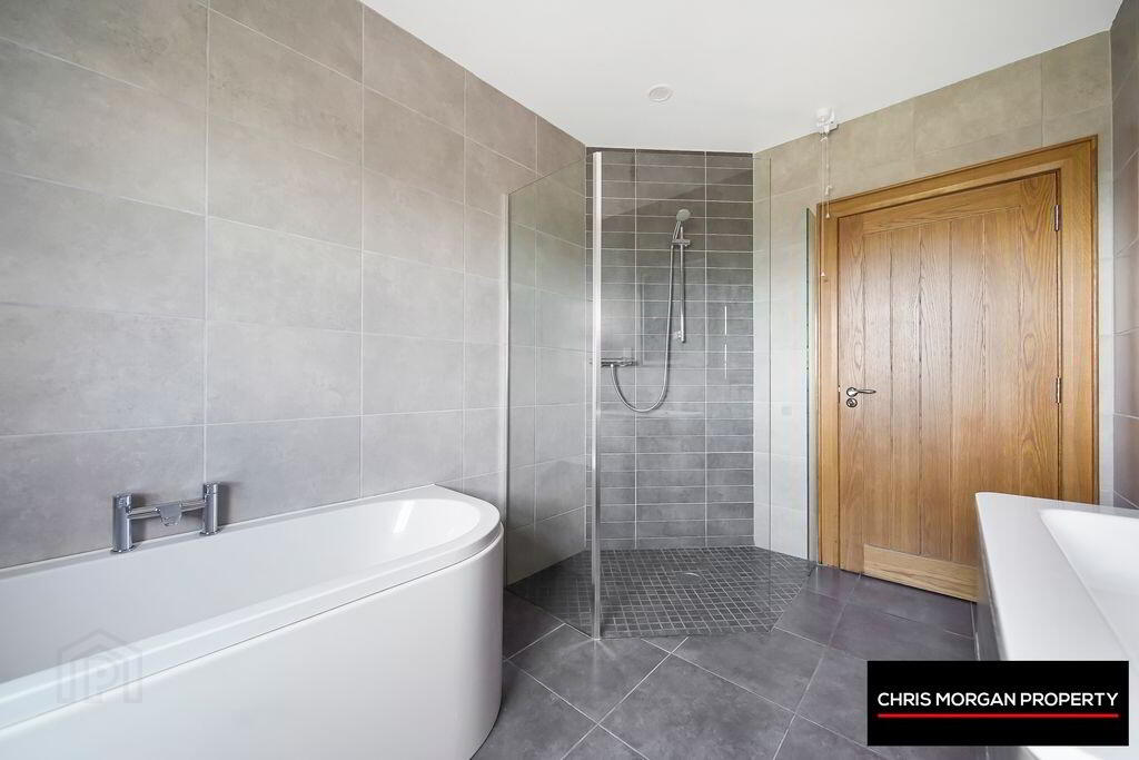 TILED FLOOR AND WALLS, WC, WHB, BATH, WALK IN SHOWER, HEATED TOWEL RAIL, EXTRA FAN