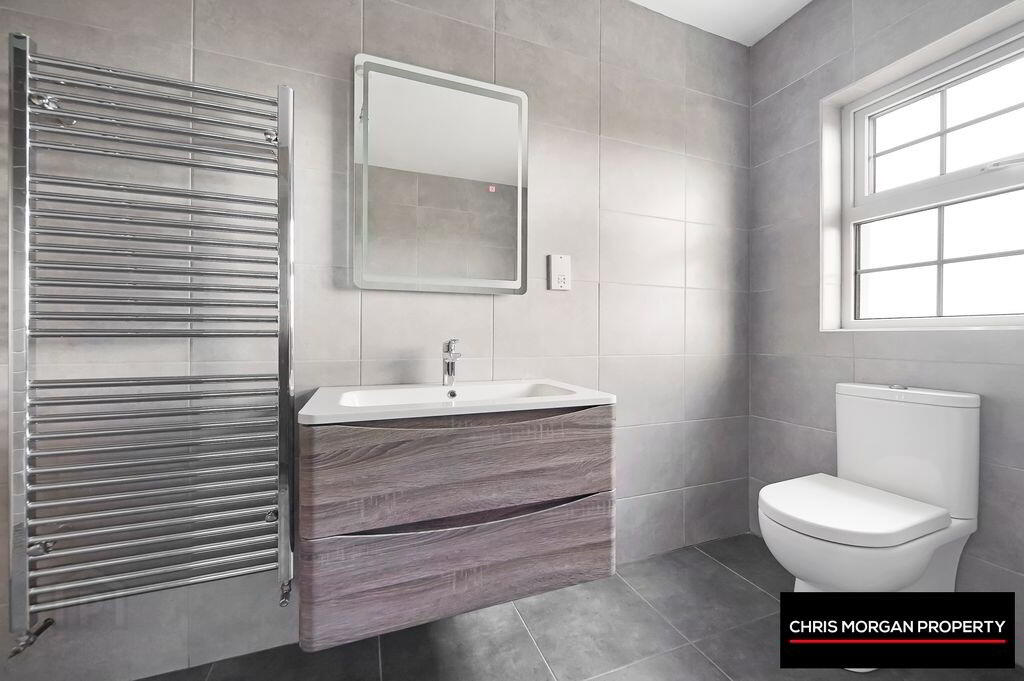 TILED FLOOR AND WALLS, WC, WHB, SINGLE RADIATOR, EXTRA FAN