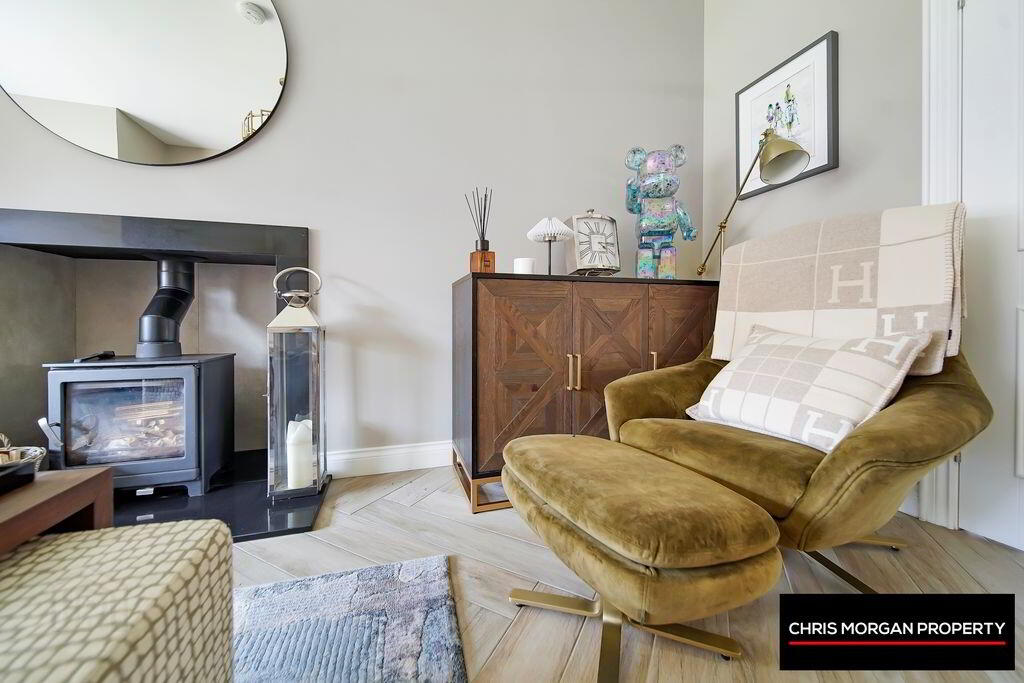 HERRINGBONE TILED FLOOR, PARKRAY WOOD BURNING STOVE IN SITU, TV POINTS, DOUBLE RADIATOR, 2 PANEL WOODEN DOORS WITH GLASS FRONTAGE LEADING TO KITCHEN AREA, WALL SOCKETS