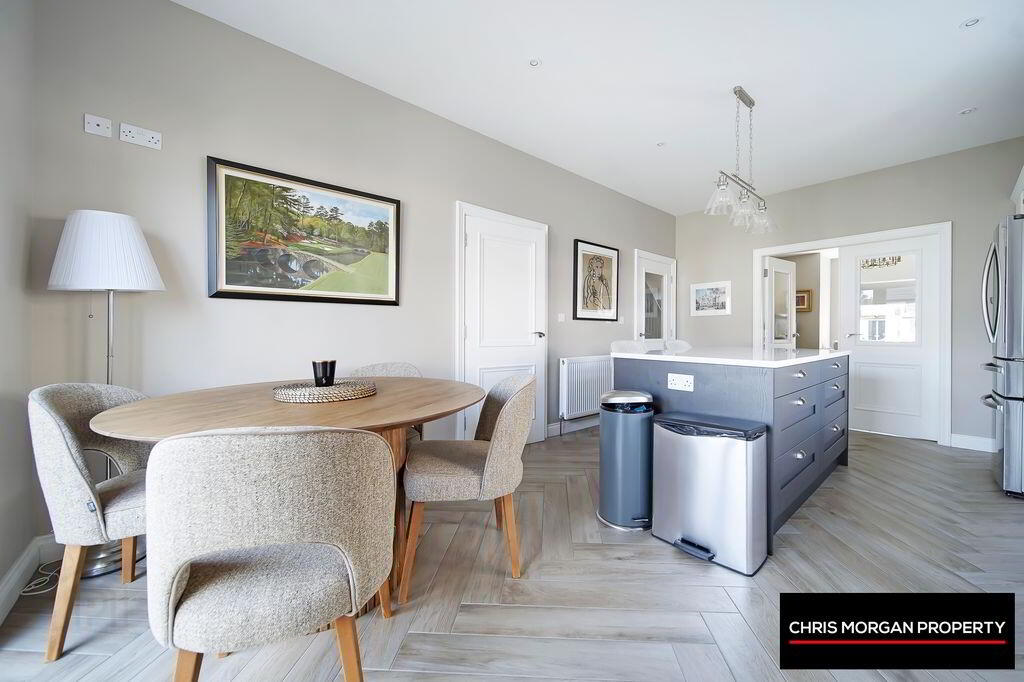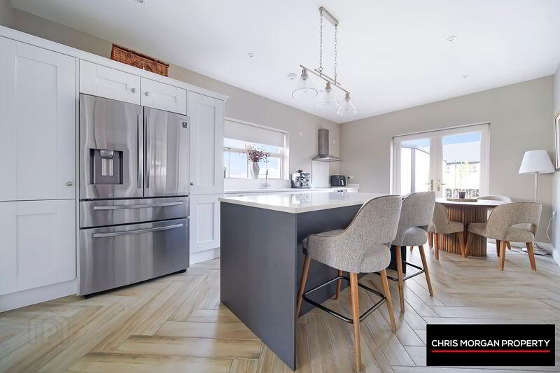 HERRINGBONE TILED FLOOR, IMPRESSIVE FITTED HIGH & LOW KITCHEN UNITS WITH QUARTZ WORKTOP, BOSCH INTEGRATED COOKER/HOB/FAN, ISLAND WITH BUILT IN STORAGE SPACE AND QUARTZ TOP, BLANCO SINK WITH LAMAR KITCHEN TAP, SPOTLIGHTS TO CEILING, DOUBLE RADIATOR, UPVC PATIO DOORS LEADING TO REAR OF PROPERTY