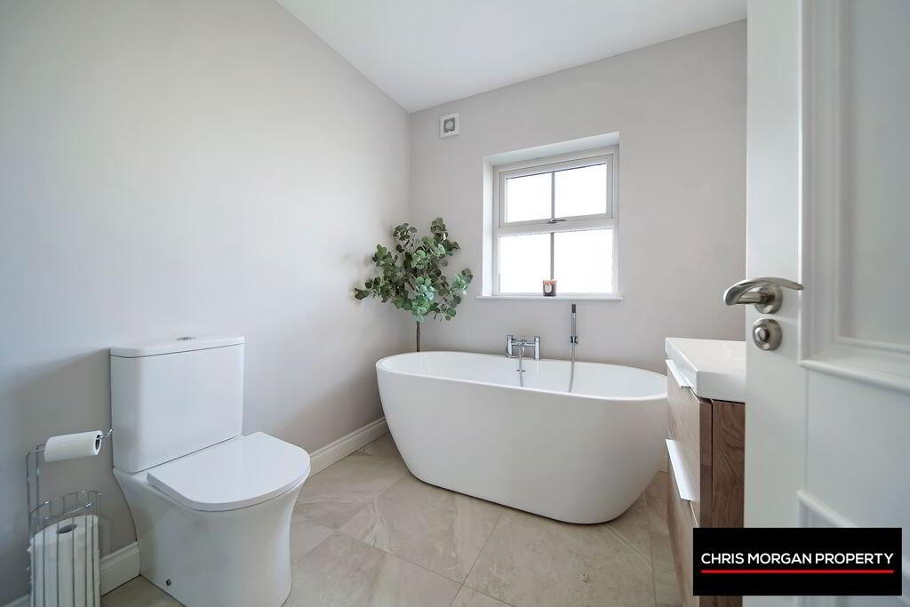 TILED FLOOR, WC, WHB WITH BUILT IN STORAGE SPACE, FREESTANDING BATH, SHOWER, HEATED TOWEL RAIL, EXTRA FAN