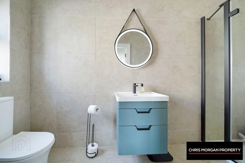 TILED FLOOR AND WALLS, WC, WHB WITH BUILT IN STORAGE SPACE, SHOWER, HEATED TOWEL RAIL, EXTRA FAN