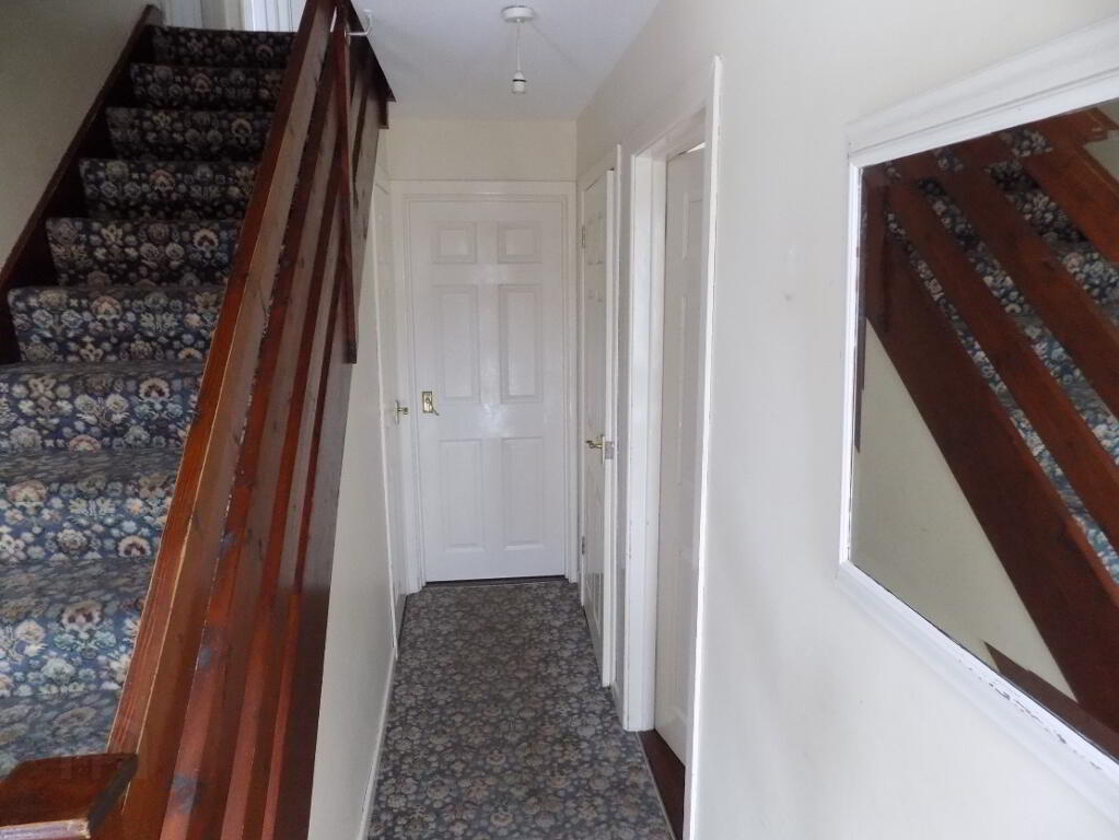 DOWNSTAIRS HALL 4.4 X 1.9 M WITH CARPETTED FLOOR AND STAIRS ALSO.