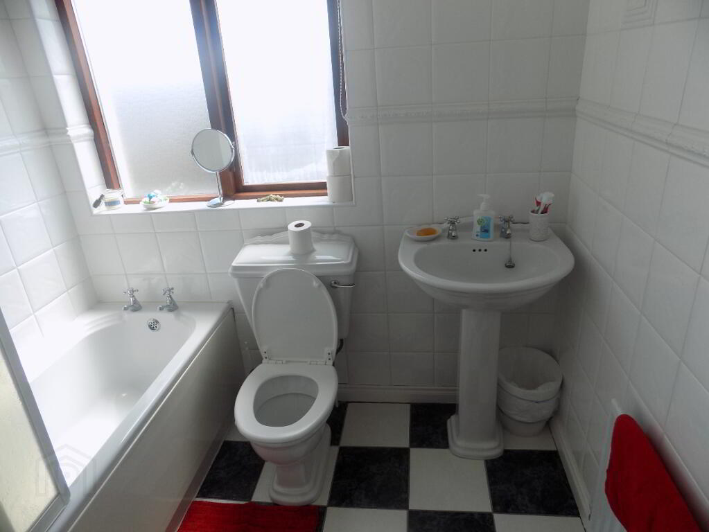 FAMILY BATHROOM 2.15 X 2.7 WITH FULLY TILED FLOOR AND WALLS AND WHB,WC BATH AND SHOWER UNIT.