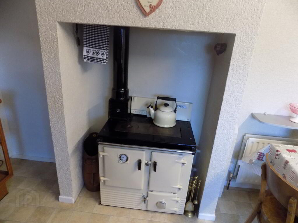 KITCHEN WITH HIGH AND LOW OAK UNITS AND SOLID FUEL BURNER AND HEATING STOVE