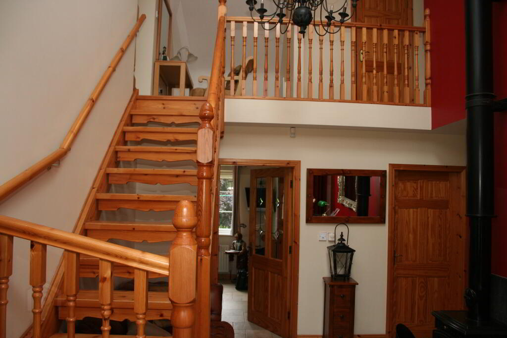 FRONT HALLWAY 4.96 X 3.365 M WITH TILED FLOOR . STOVE AND HEIGHTENED CEILING WITH WINDOWLIGHT / SKYLIGHT AND PINE STAIRCASE TO HALL LANDING ON FIRST FLOOR