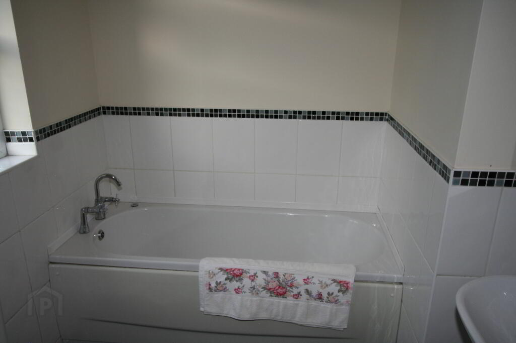 FAMILY BATHROOM 2.1 X 2.99 M WITH TILED FLOOR AND WALLS , WHITE WHB, WC , BATH AND SEPARATE SHOWER UNIT .