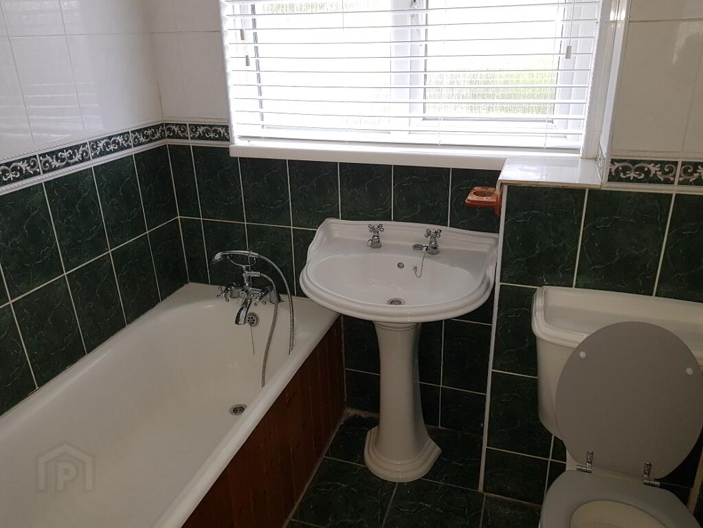 FAMILY BATHROOM 1.9 X 1.6 M , TILED FLOOR AND FULLY TILED WALLS WITH WHITE SUITE INC WHB, BATH WITH SHOWER AND WC .