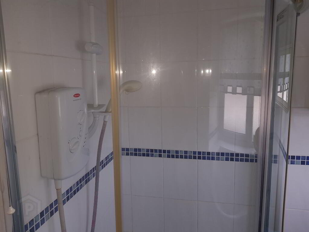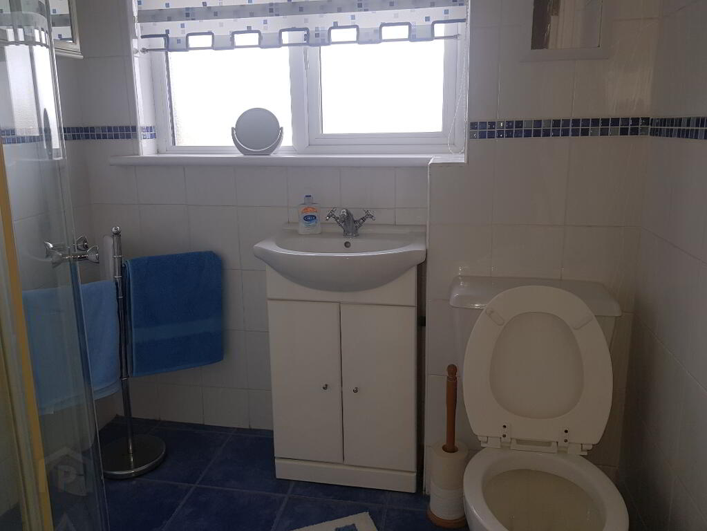 family bathroom 2.1 x 1.88 m with separate shower unit , wc , whb fully tiled walls and floors