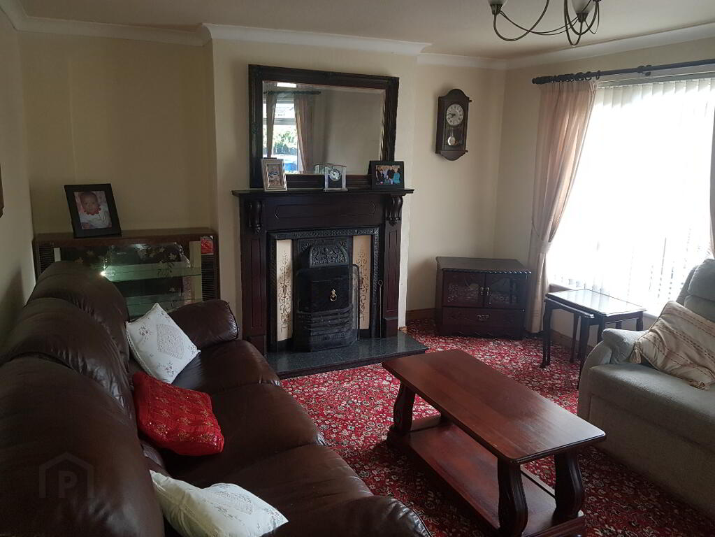 living room 5.1 x 3.8 m with carpet floor and wooden surround and tiled fireplace