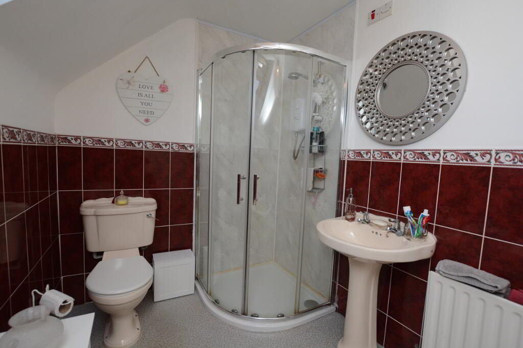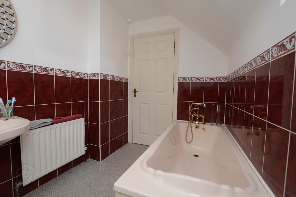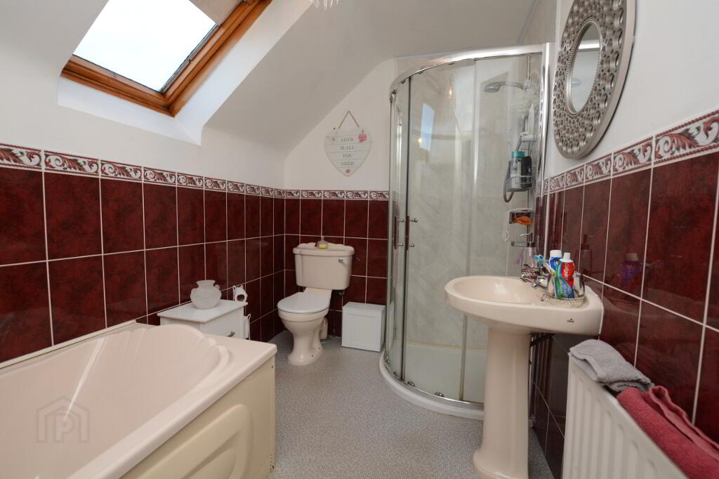 family bathroom 1.85m x 3.28m with tiled floor , 1/2 tiled walls and bath, wc , whb and separate shower included and tastefully finished.