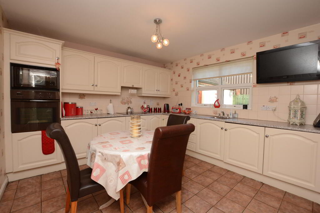 family kitchen 3.53 x 3.47 m with tiled floor area and high and low oak units with integrated appliances