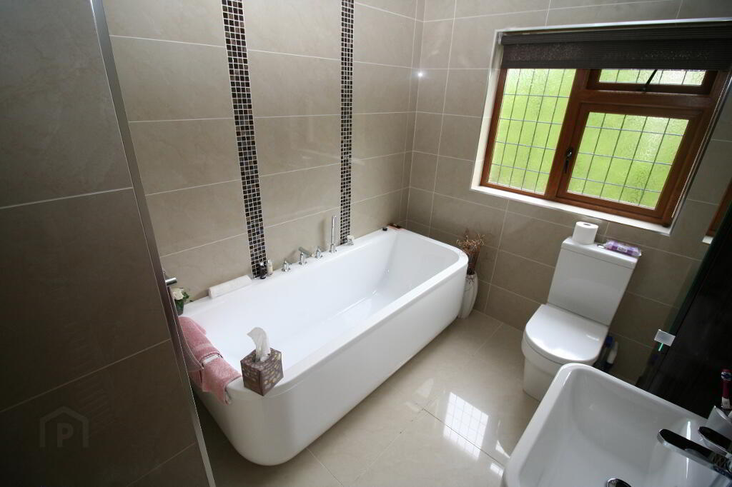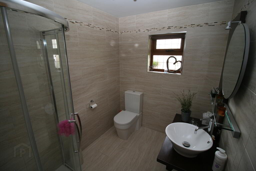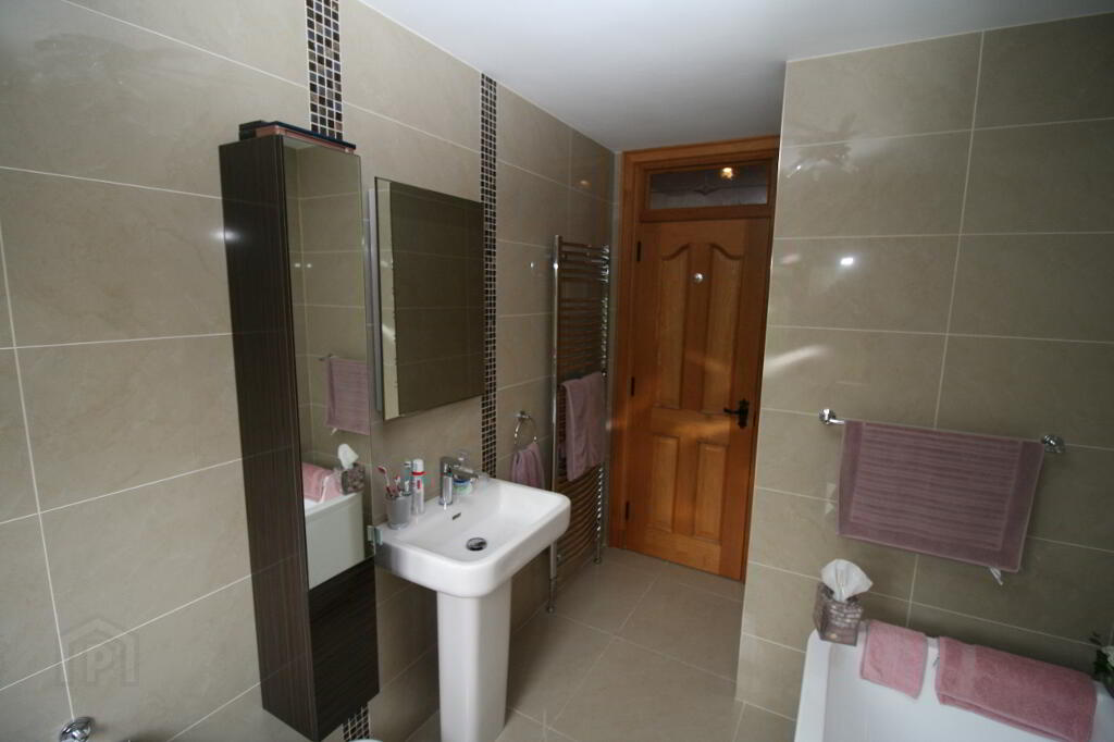 family bathroom 2.10 x 3.20 m with tiled floor , walls and whb , wc , shower and bath