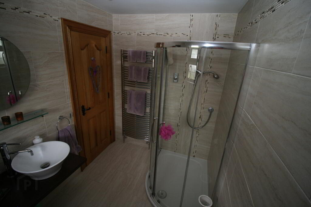 downstairs bathroom 2.3 x 1.9 m with tiled floor and walls . wc , shower, towel rack and whb white suite