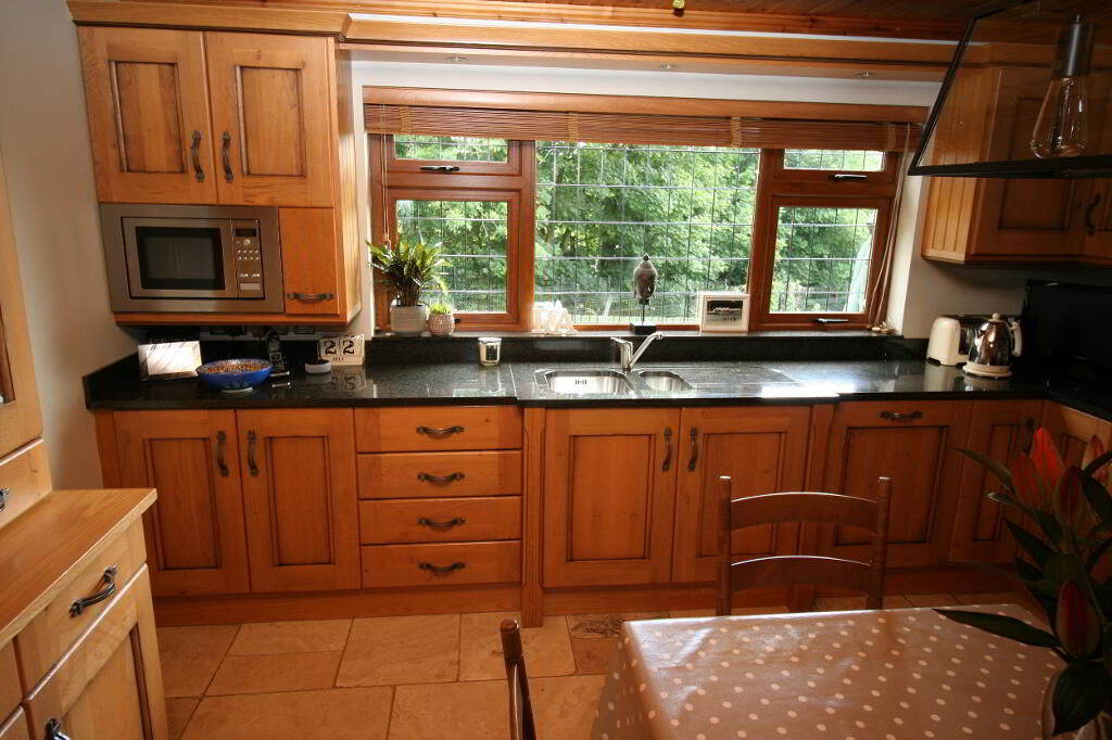family kitchen 4.3 x 4.8 m with high and low oak kitchen units with integrated appliances and tiled finished floor