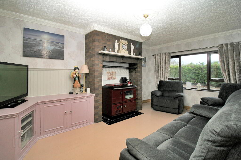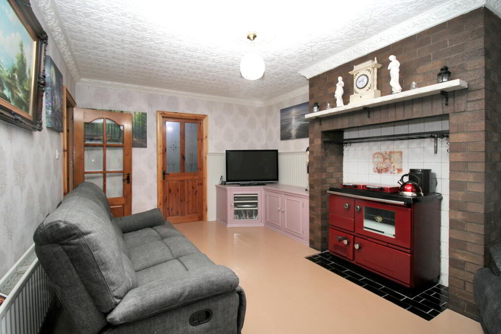 LIVING ROOM 5.34 X 3.3M WITH WOODEN FLOOR AND RAYBURN COOKER IN SITU
