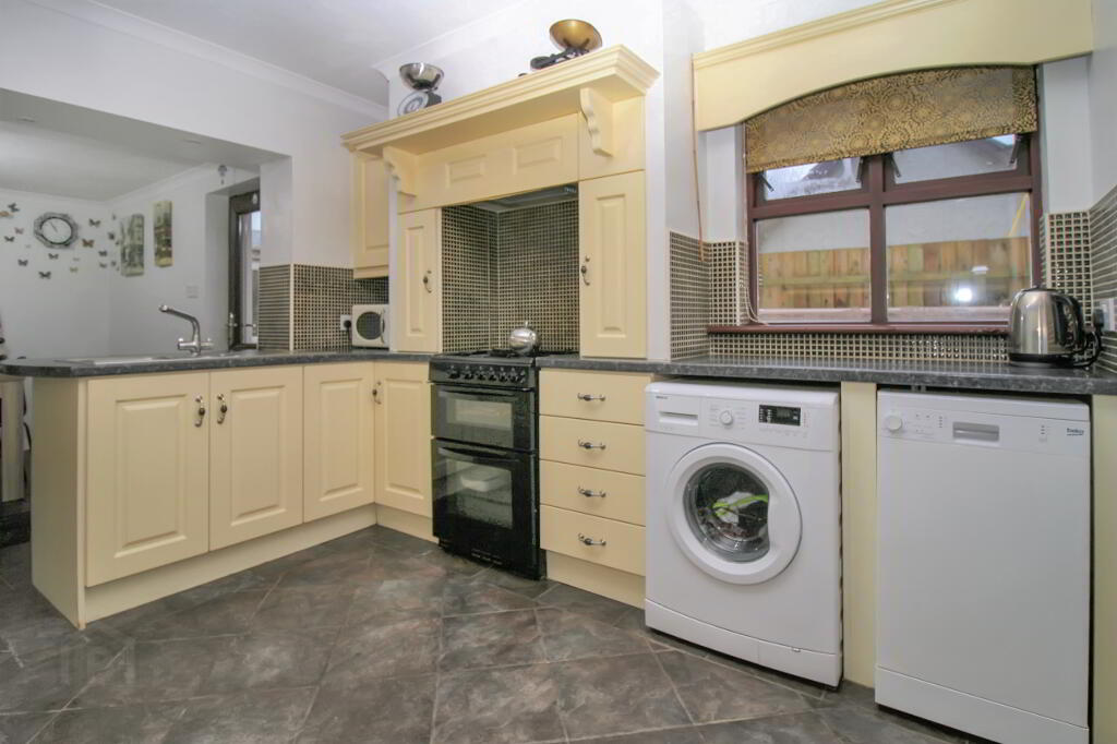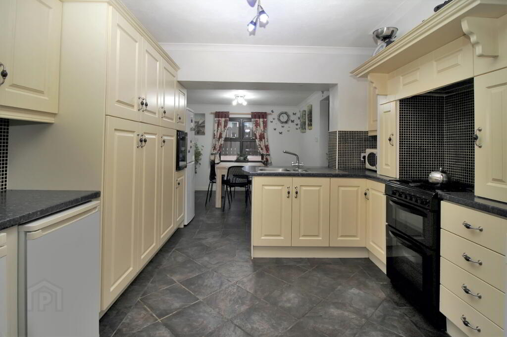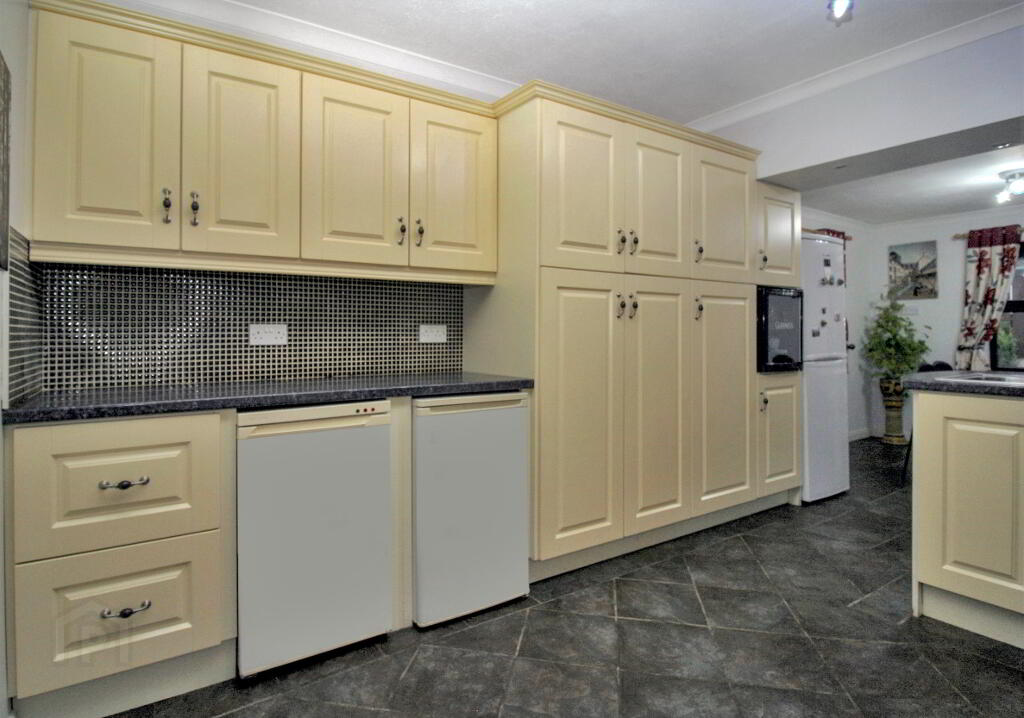 KITCHEN 3.35 X 7.1M WITH HIGH AND LOW UNITS WITH MANTLE OVER THE COOKER AREA AND ISLAND WITH SINGLE DRAINER AND SS TAPS . ALSO TILED FLOOR AREA .