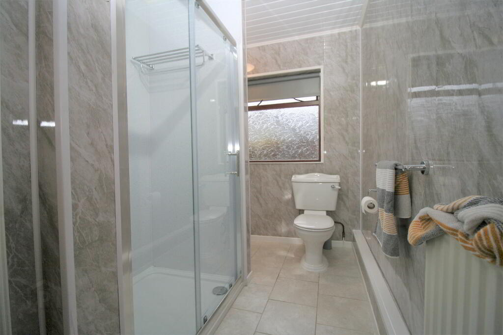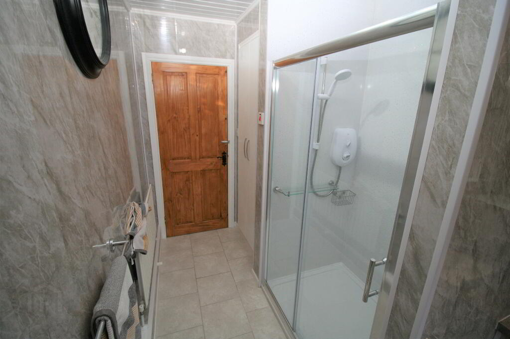 FAMILY BATHROOM 2 X 3.5 M WITH TILED FLOOR AND WALLS WITH SEPARATE SHOWER, TOWEL RAIL, WHB AND WC .