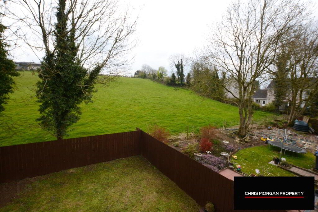 REAR ENCLOSED GARDEN WITH PATIO AREAS LEADING FROM DOULBLE PATIO DOORS AND VIEWS OF COUNTRYSIDE .