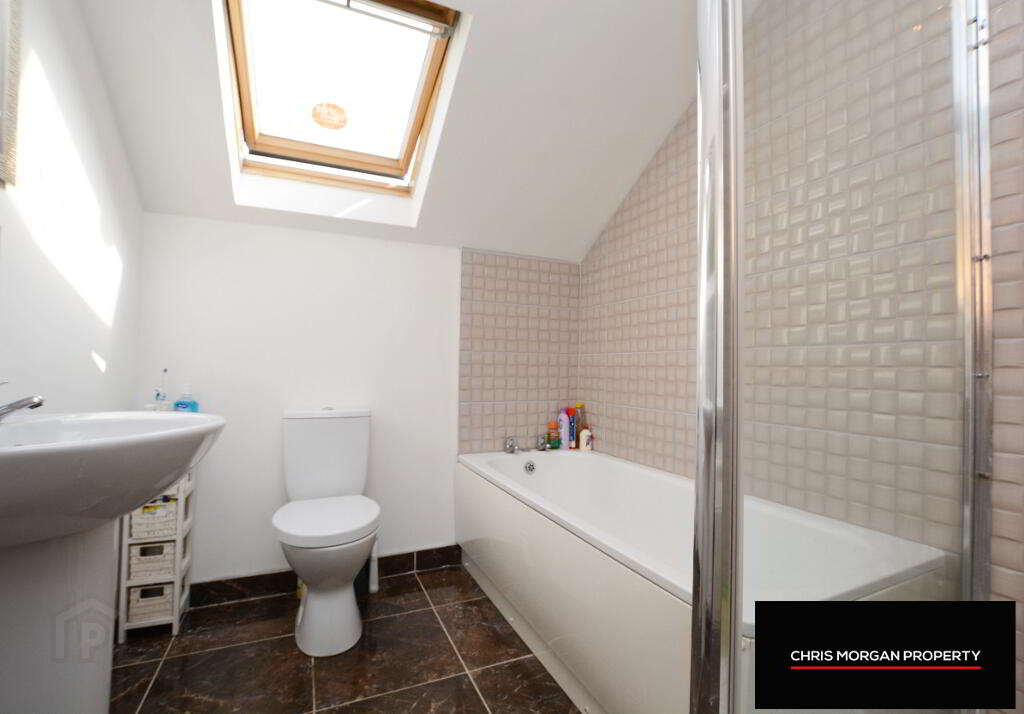 FAMILY BATHROOM 3.83 X 2.5 M WITH TILED FLOOR AND WALLS . SEPARATE SHOWER UNIT WITH WHB, WC .