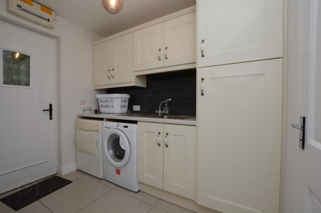 UTILITY ROOM 2.74 X 1.85 M WITH GLAZED TILE FLOOR AND HIGH AND LOW UNITS WITH 1 1/4 STAINLESS STEEL SINK.