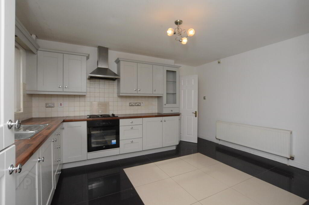 KITCHEN AREA 4.3 X 3.6 M WITH GLAZED TILED FLOOR , PAINTED KITCEN WITH HIGH AND LOW UNITS . FULLY INTEGRATED WHITE GOODS AND STAINLESS STEEL EXTRACTION FAN UNIT.