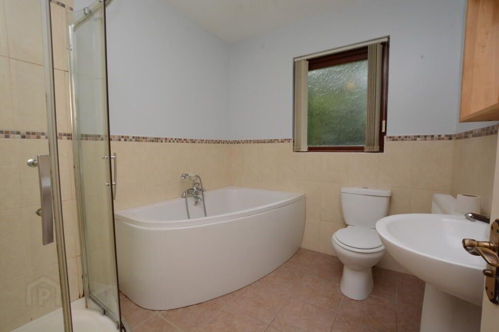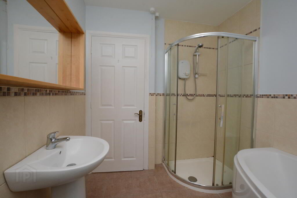 FAMILY BATHROOM 2.6 X 2.1 M WITH TILED WALL AND FLOOR , WC, BATH , WHB AND SEPARATE SHOWER UNIT.