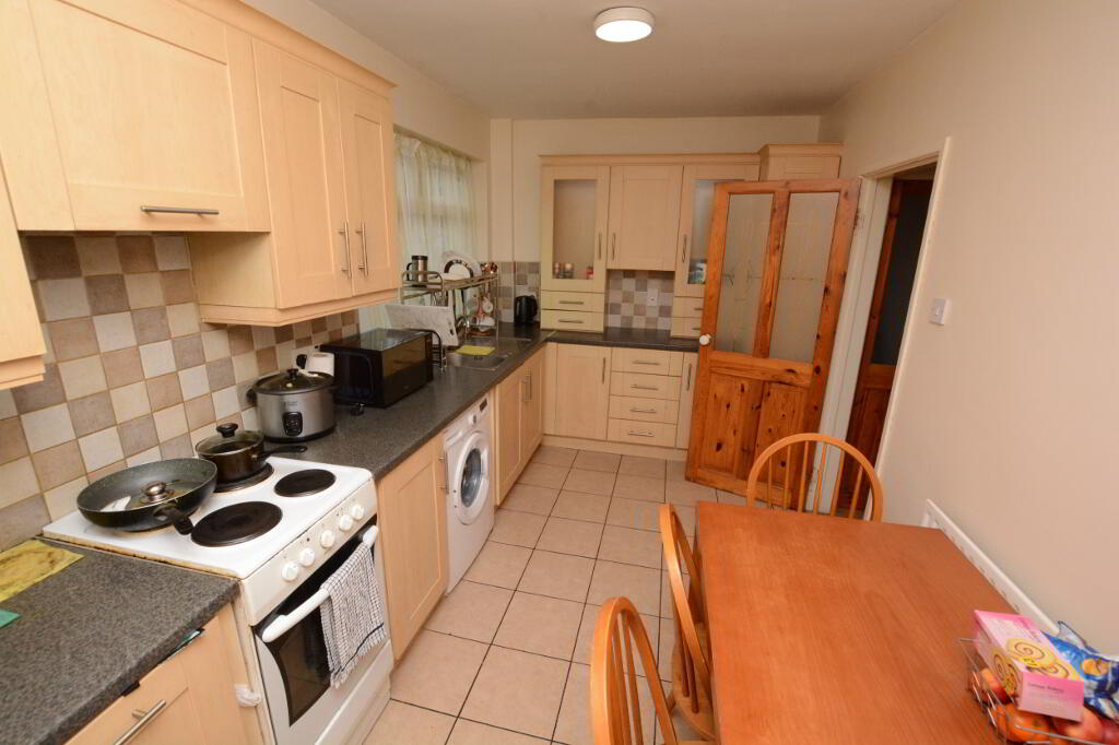 KITCHEN - 5.0 X 2.4 M - TILED FLOOR, HIGH AND LOW UNITS, STAINLESS STEEL SINK, COOKER AND HOB, SPACIOUS DINING AREA.