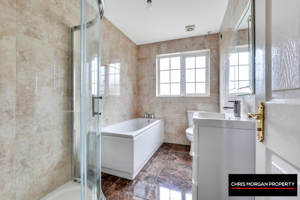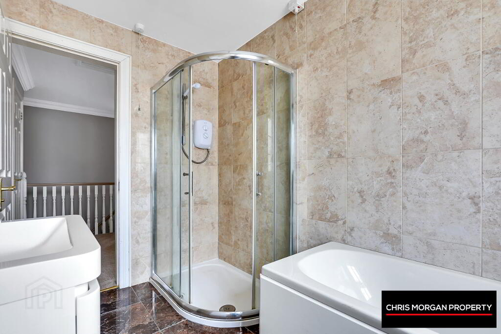 FAMILY BATHROOM 3.4 X 3.1 M WITH FULLY TIELD FLOOR AND WALLS , WC, WHB AND SHOWER UNIT