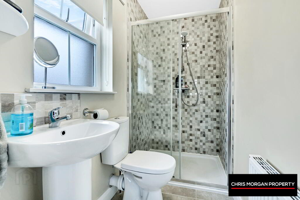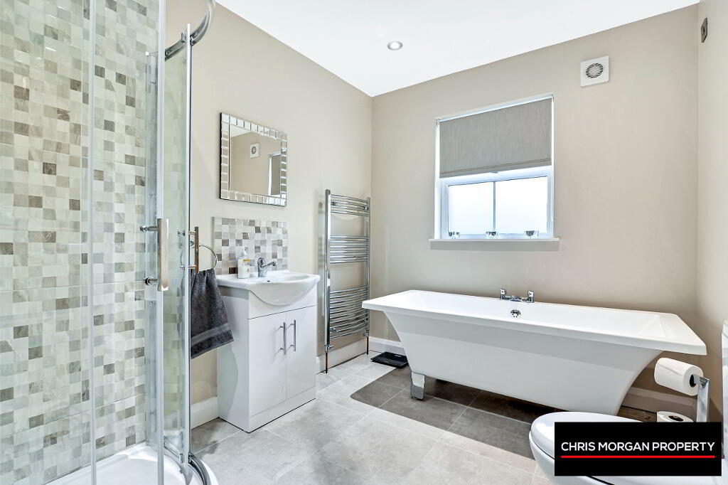 FAMILY BATHROOM 2.9 X 2.4M WITH TILED FLOOR , WC, BATH , VANITY UNIT AND WHB AND SHOWER UNIT .