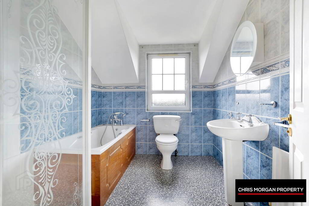 FAMILY BATHROOM 2.7 X 2.4M WITH FLOOR COVERING , TILED WALLS AND WHB. WC, BATH AND SEPARATE SHOWER