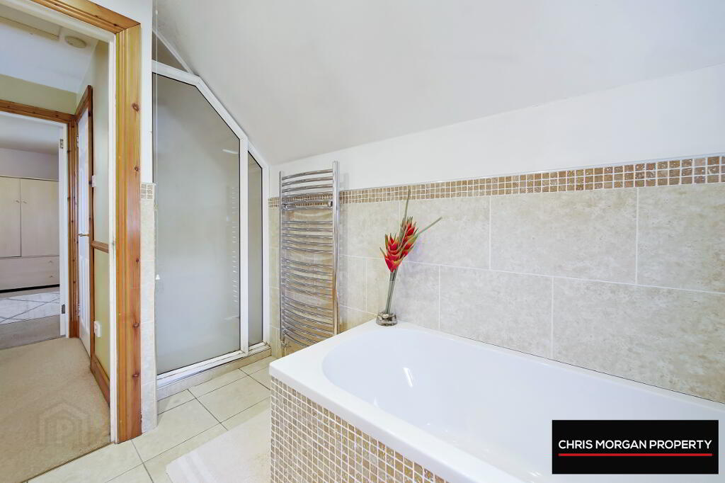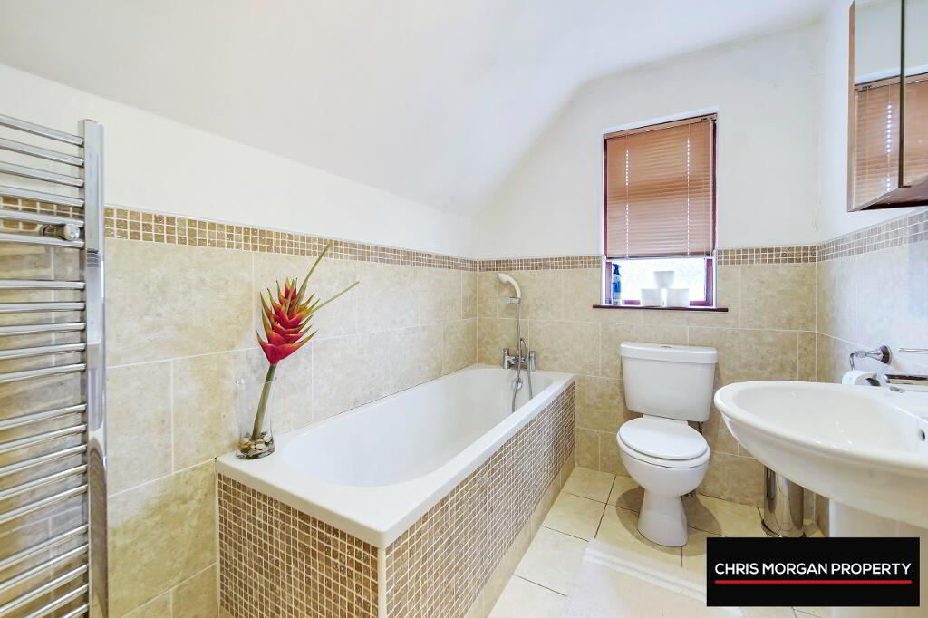FAMILY BATHROOM - TILED FLOOR AND WALLS, WC, WHB, HEATED TOWEL WRACK, ELECTRIC SHOWER, EXTRA FAN, SINGLE RADIATOR, SPOTLIGHTS, BATH WITH SHOWER HEAD