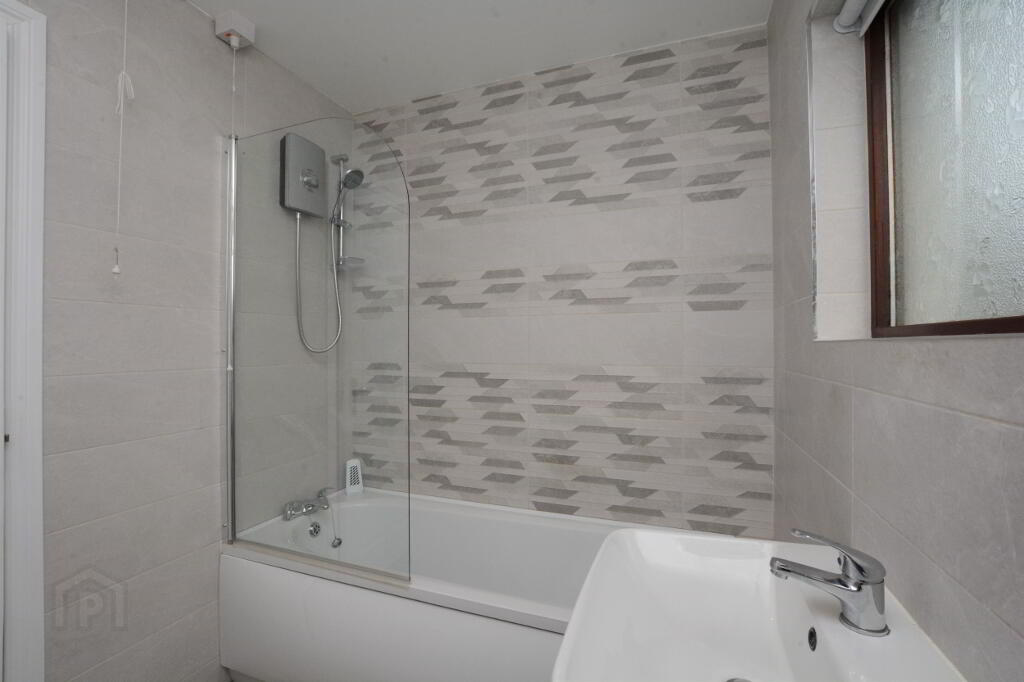 FAMILY BATHROOM 1.85 X 2.2 M - WOODEN FLOOR, TILED WALL, WC , WHB , BATH WITH ELECTRIC SHOWER, HEATED TOWEL WRACK
