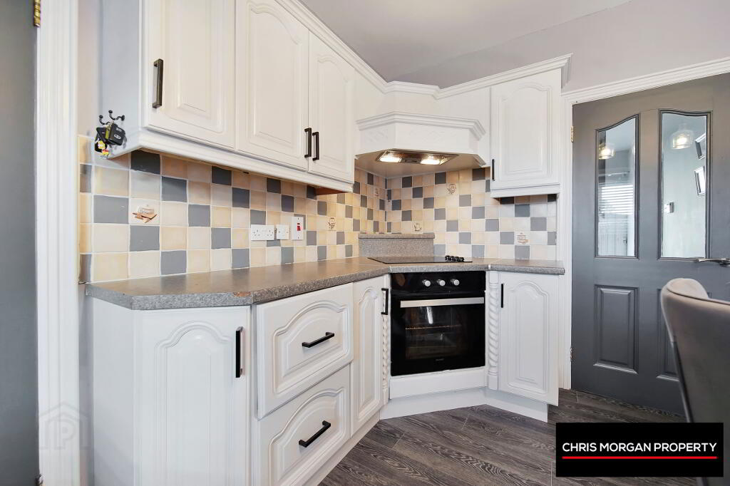 LAMINATE FLOOR COVERING, HIGH AND LOW UNITS WITH BUILT IN COOKER/HOB AND FAN, TILED SPLASHBACK WALLS, STAINLESS STEEL SINK WITH DRAINER TAP, TV POINTS TO WALL, DOUBLE RADIATOR, WALL SOCKETS, UPVC DOUBLE DOORS LEADING TO REAR OF PROPERTY