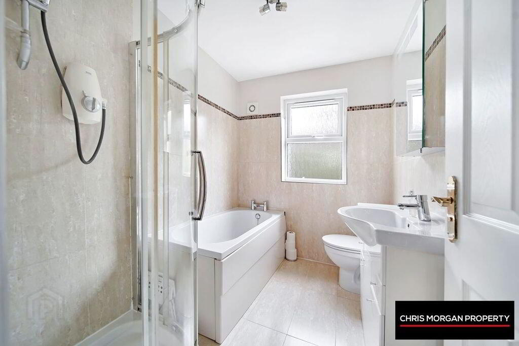 4 PIECE FAMILY BATHROOM, TILED FLOOR AND WALLS, WC, WHB WITH BUILT IN STORAGE SPACE, MOUNTED WALL MIRROR, BATH, SHOWER, TOWEL RACK, EXTRA FAN