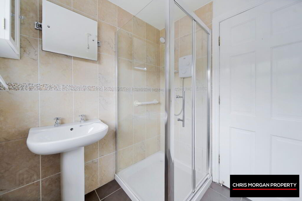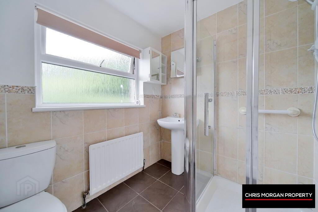 TILED FLOOR AND WALLS, SHELVED HOTPRESS AREA, WC, WHB, SHOWER, SINGLE RADIATOR, EXTRA FAN
