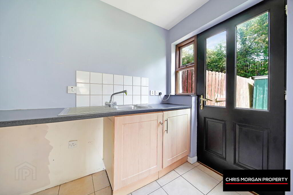 WOODEN DOOR LEADING TO REAR OF PROPERTY, HIGH & LOW UNITS WITH SPACE FOR BUILT IN APPLIANCES, STAINLESS STEEL SINK WITH DRAINER TAP, TILED FLOOR, SINGLE RADIATOR, EXTRA FAN