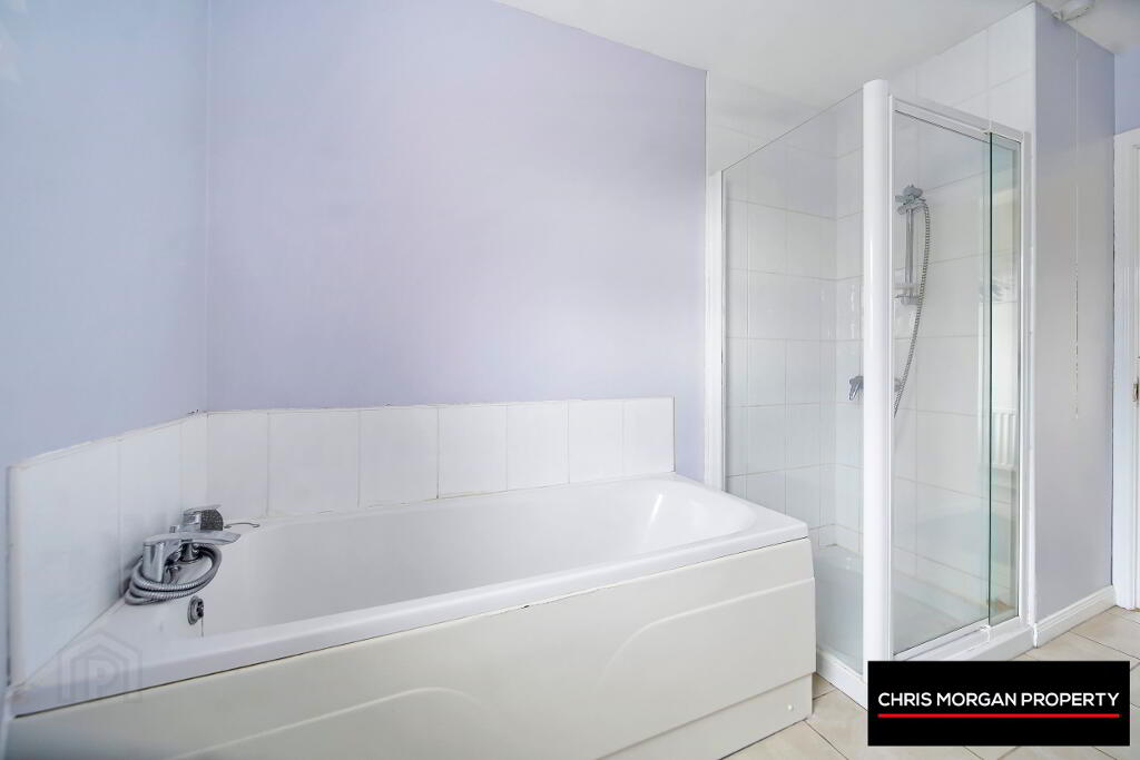 TILED FLOOR, WC, WHB, BATH, SHOWER, DOUBLE RADIATOR, EXTRA FAN