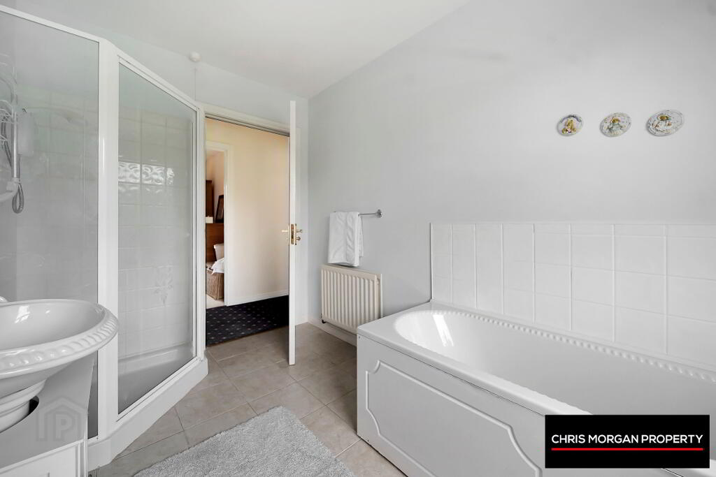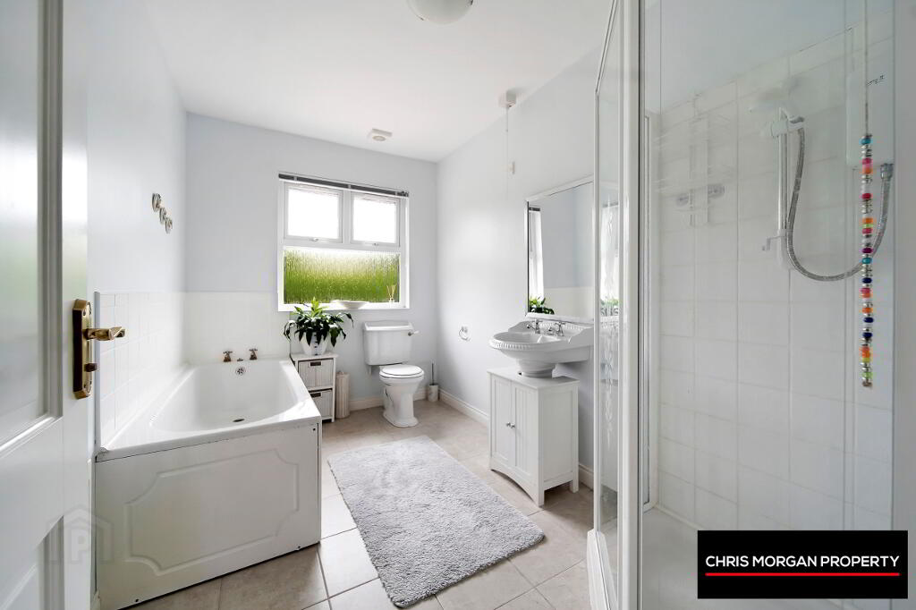 TILED FLOOR, WC, WHB WITH STORAGE SPACE, SHOWER, BATH, DOUBLE RADIATOR, EXTRA FAN