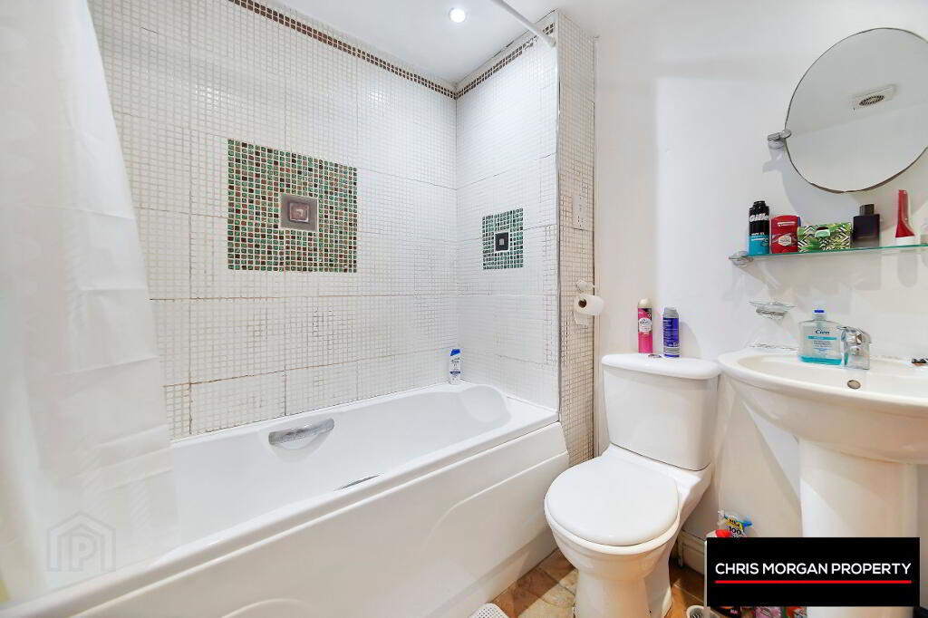 TILED FLOOR & WALLS, WC, WHB, BATH WITH SHOWER HEAD, SPOTLIGHTS TO CEILING, SINGLE RADIATOR, EXTRA FAN