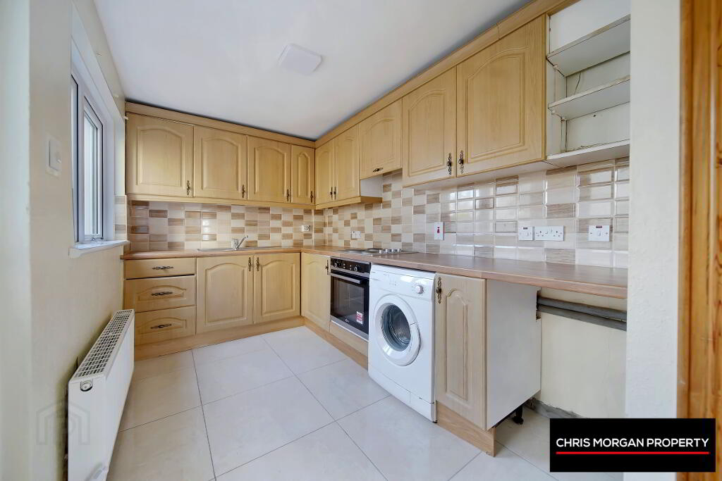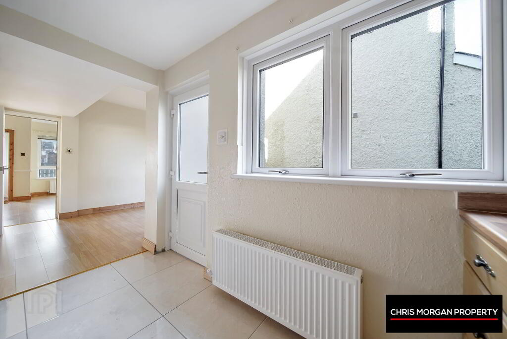 TILED FLOOR AND SPLASHBACK WALLS, HIGH AND LOW UNITS WITH INTEGRATED COOKER/HOB, STAINLESS STEEL SINK WITH WASHER TAP, DOUBLE RADIATOR, WALL SOCKETS, HEATING CONTROLS TO WALL, UPVC DOOR LEADING TO REAR OF PROPERTY