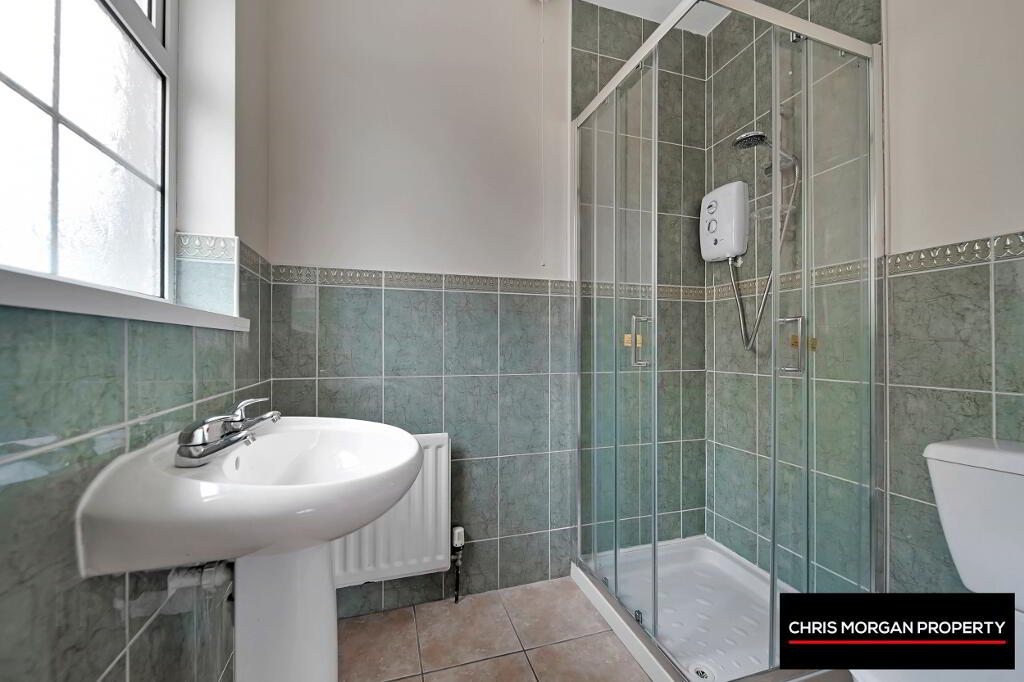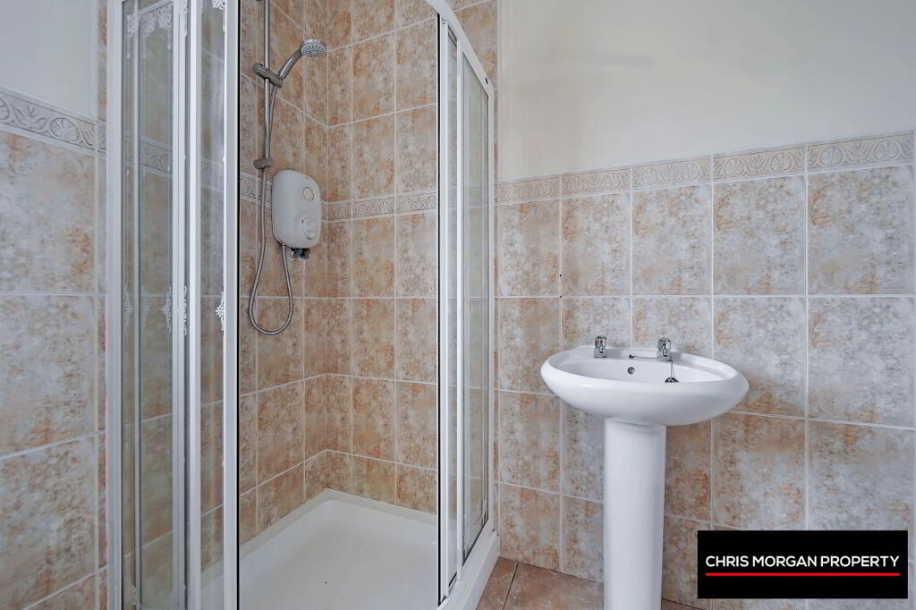 TILED FLOOR & WALLS, WC, WHB, SHOWER, SINGLE RADIATOR, EXTRA FAN