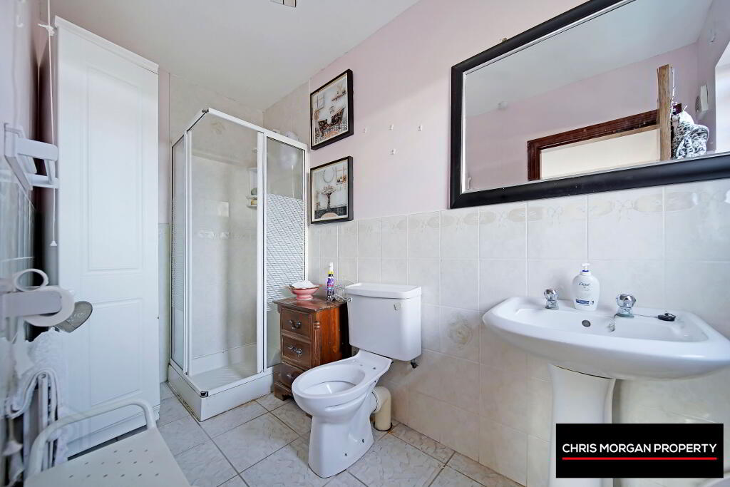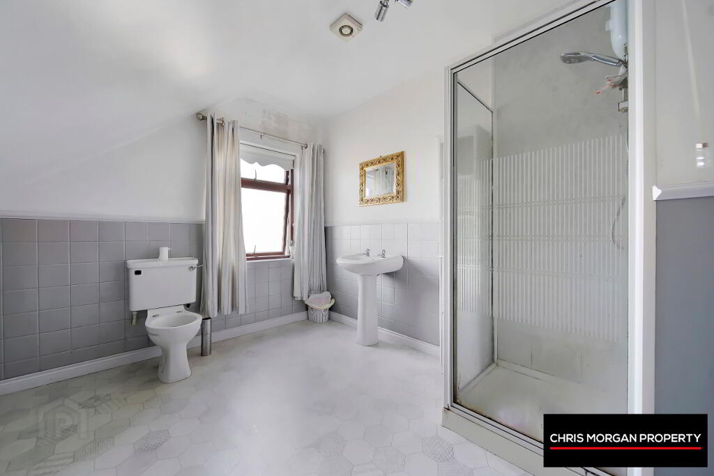 TILED FLOOR AND WALLS, WC, WHB, SHOWER, SINGLE RADIATOR, EXTRA FAN