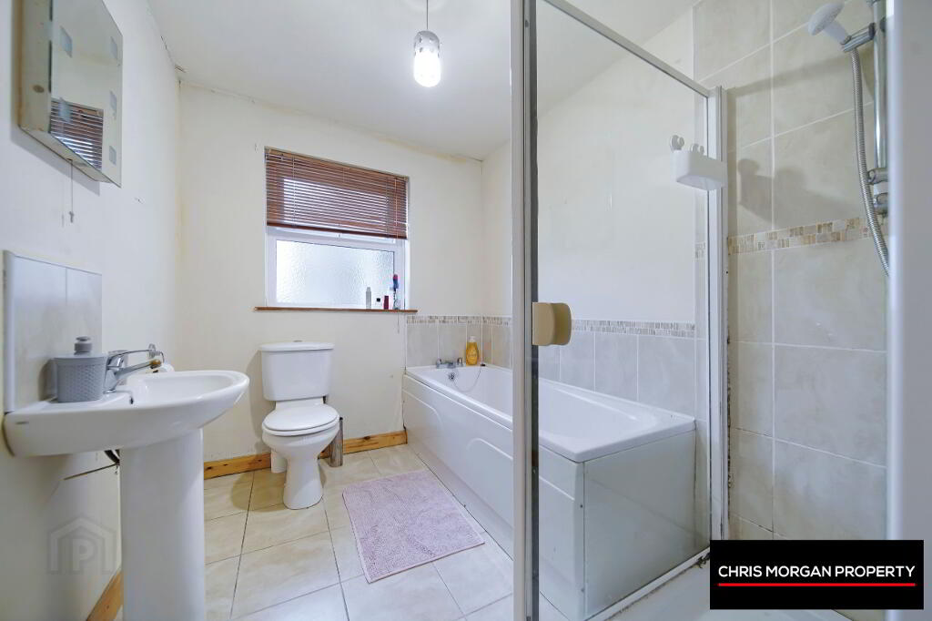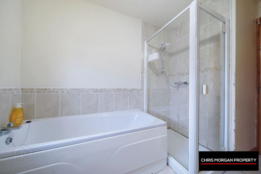 TILED FLOOR, WC, WHB, BATH, SHOWER, DOUBLE RADIATOR, EXTRA FAN